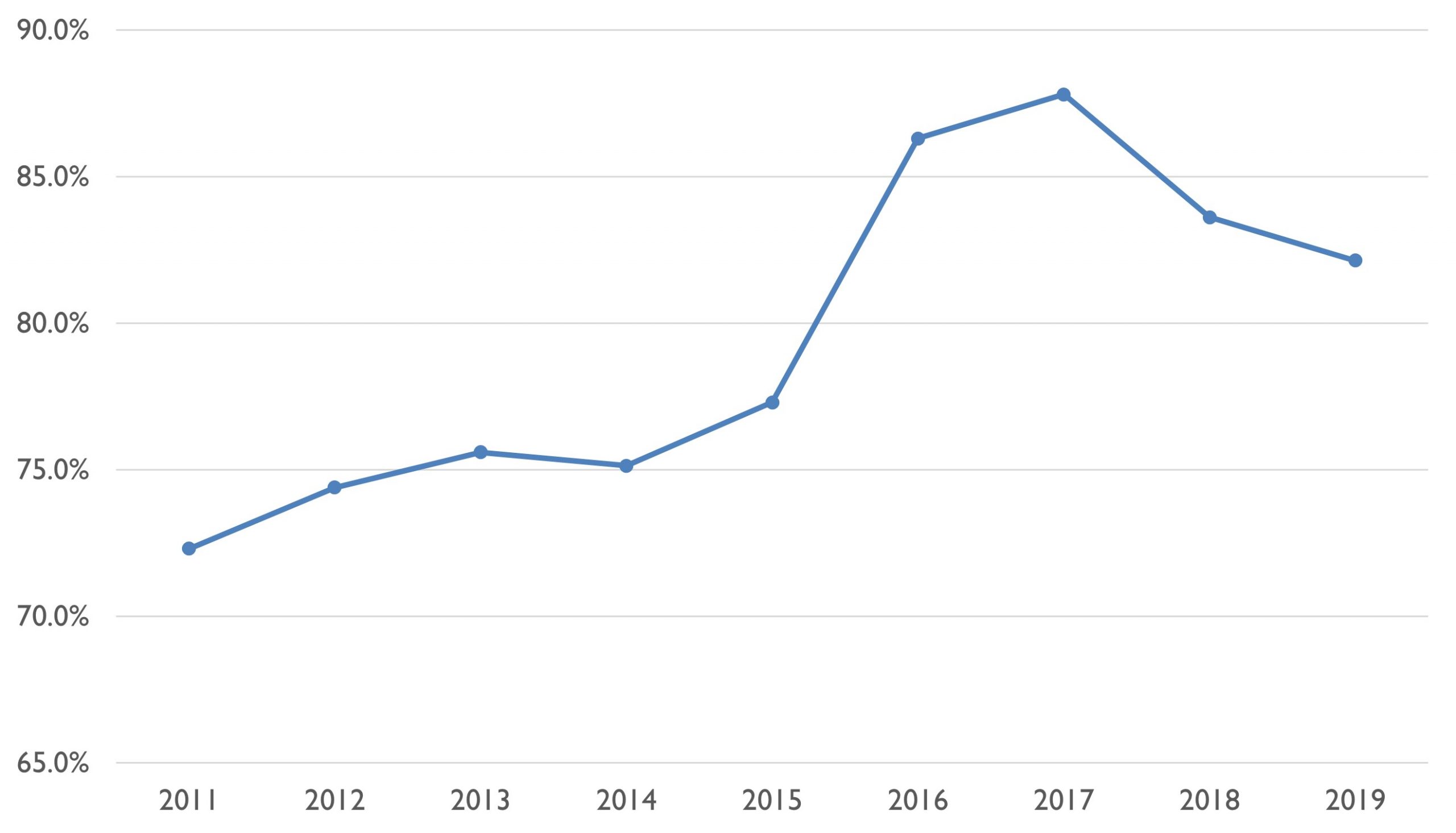 Traditionally, banks have been the main source of financing for capital-constrained companies. However, many of these firms have credit ratings below investment grade or lack any credit history, making it challenging for banks to provide loans. According to the National Credit Union Administration (NCUA) of the USA, as of 2019 Q2, 82.1% of US companies fell below investment grade (NCUA, 2019). Figure 1‑1 illustrates the increasing trend of firms below investment grade from 2011-2019.